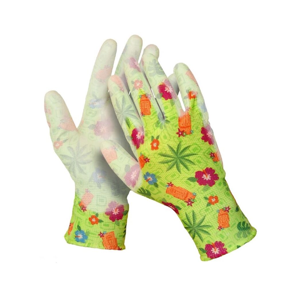 Rukavice z jemného polyesteru, povrstvené v dlani a prstech tenkou vrstvou polyuretanu. Pružná manžeta zakončená lemováním.