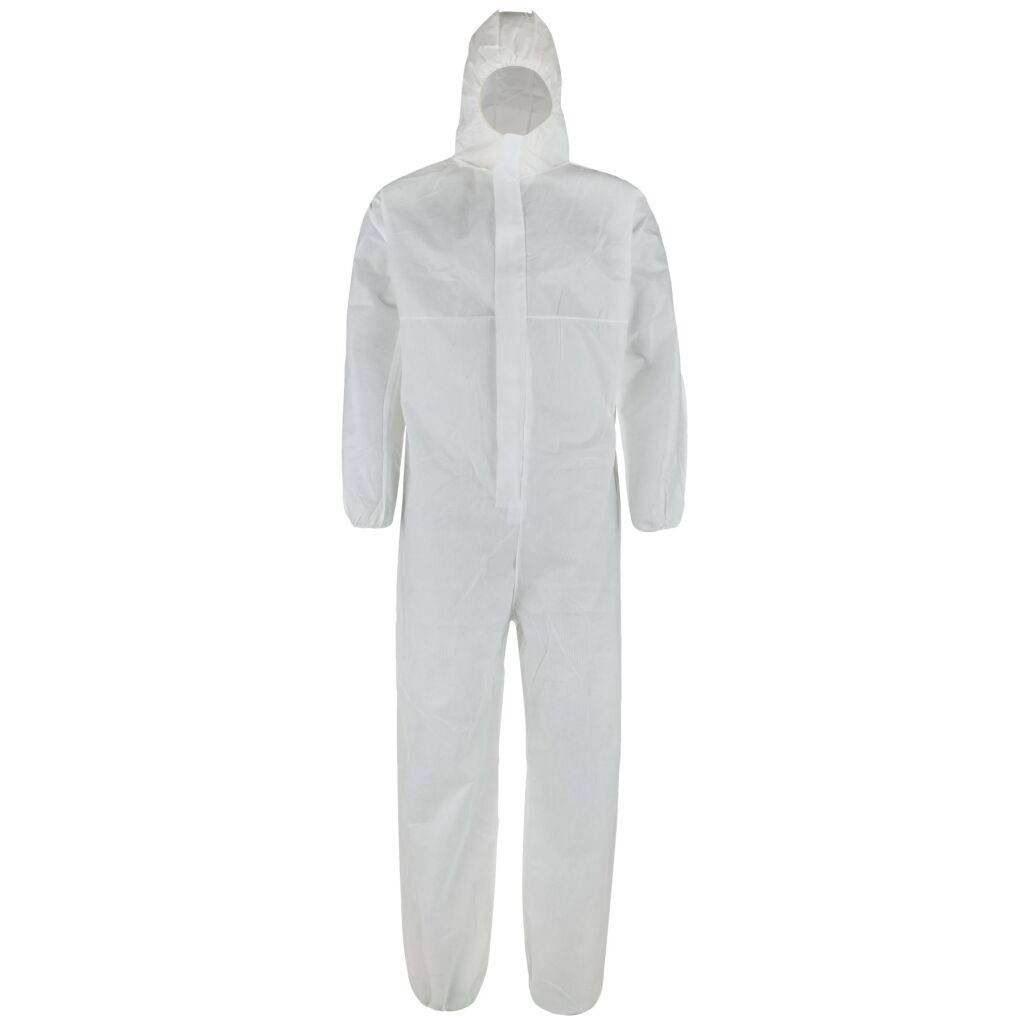 Ochrana před škodlivými látkami. Ochrana citlivých výrobků před kontaminací člověkem. Ochrana proti jemným částicím prachu. Prodyšný, pohodlný. Ochranný prodyšný oděv s kapucí z netkané textilie - SMS. Rozšířený vyztužený rozkrok. Gumička ke stažení v kapuci, v zádech, na konci rukávu na konci nohavice. Celý overal (včetně švů a zipu) v bílé barvě.