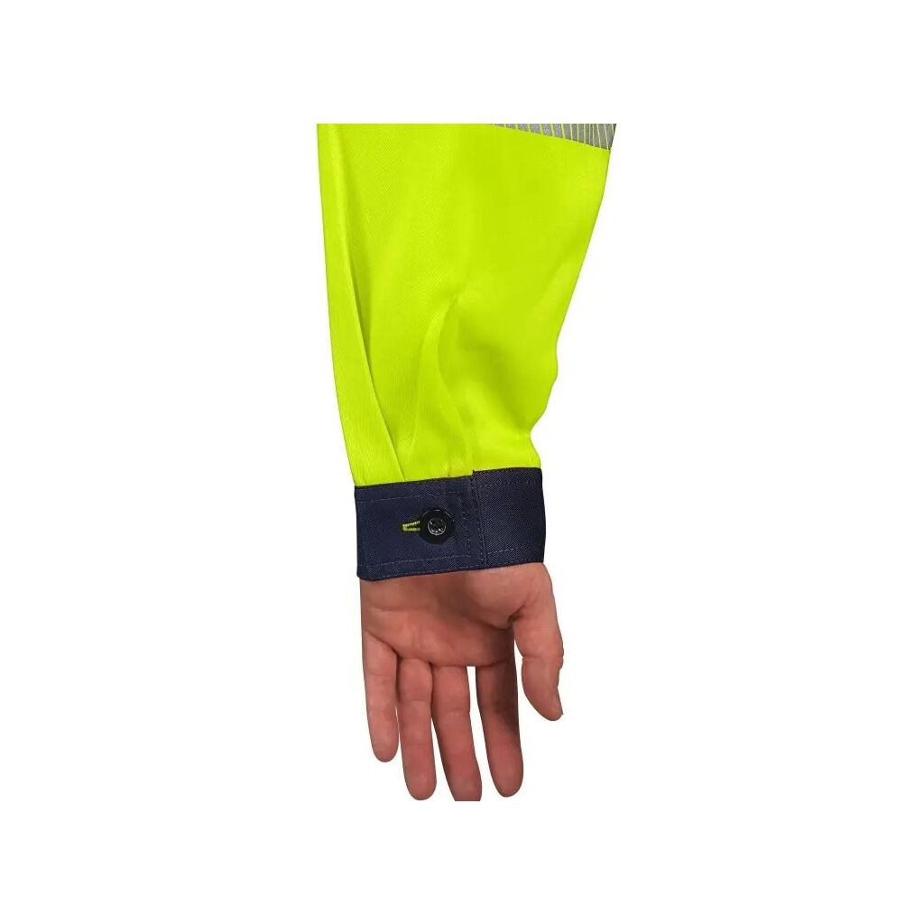 Pánská výstražná blůza se segmentovanými reflexními pásky (šířka 5 cm). Pevná keprová vazba zajišťuje pevnost a odolnost materiálu. Blůza je vybavena krytým zapínáním na plastové knoflíky, náprsními kapsami s klopou na suchý zip – levá se skrytou kapsou na zip, pravá s menší kapsou na tužku a bočními kapsami. Manžety rukávů jsou zapínány na plastový knoflík. Doporučené použití: stavebnictví, silničáři, řidiči, údržba, logistika, letecká a lodní doprava, popeláři, záchranáři.