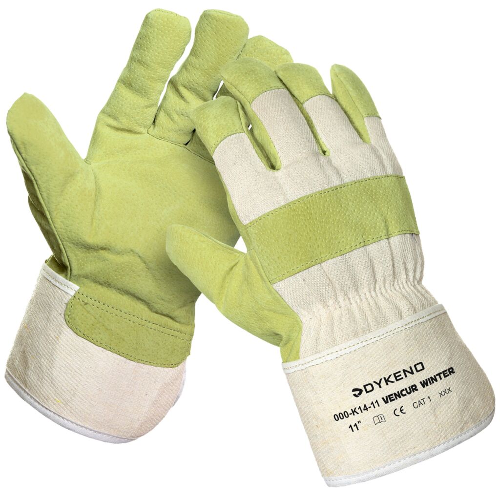 Cena za 50 párů. Kombinované zimní pracovní rukavice, dlaň, prsty s překrytím konečků prstů z měkké vepřové štípenky. DYKENO Therm - teplá akrylová podšívka v celé rukavici. Hřbet z bavlněné tkaniny s kombinací vepřové štípenky. Vyztužená látková lehce pogumovaná manžeta zakončená lemováním. Optimální pohodlí. Dobrá mechanická odolnost. Dobré úchopové vlastnosti. Příznivá ochrana před chladem.